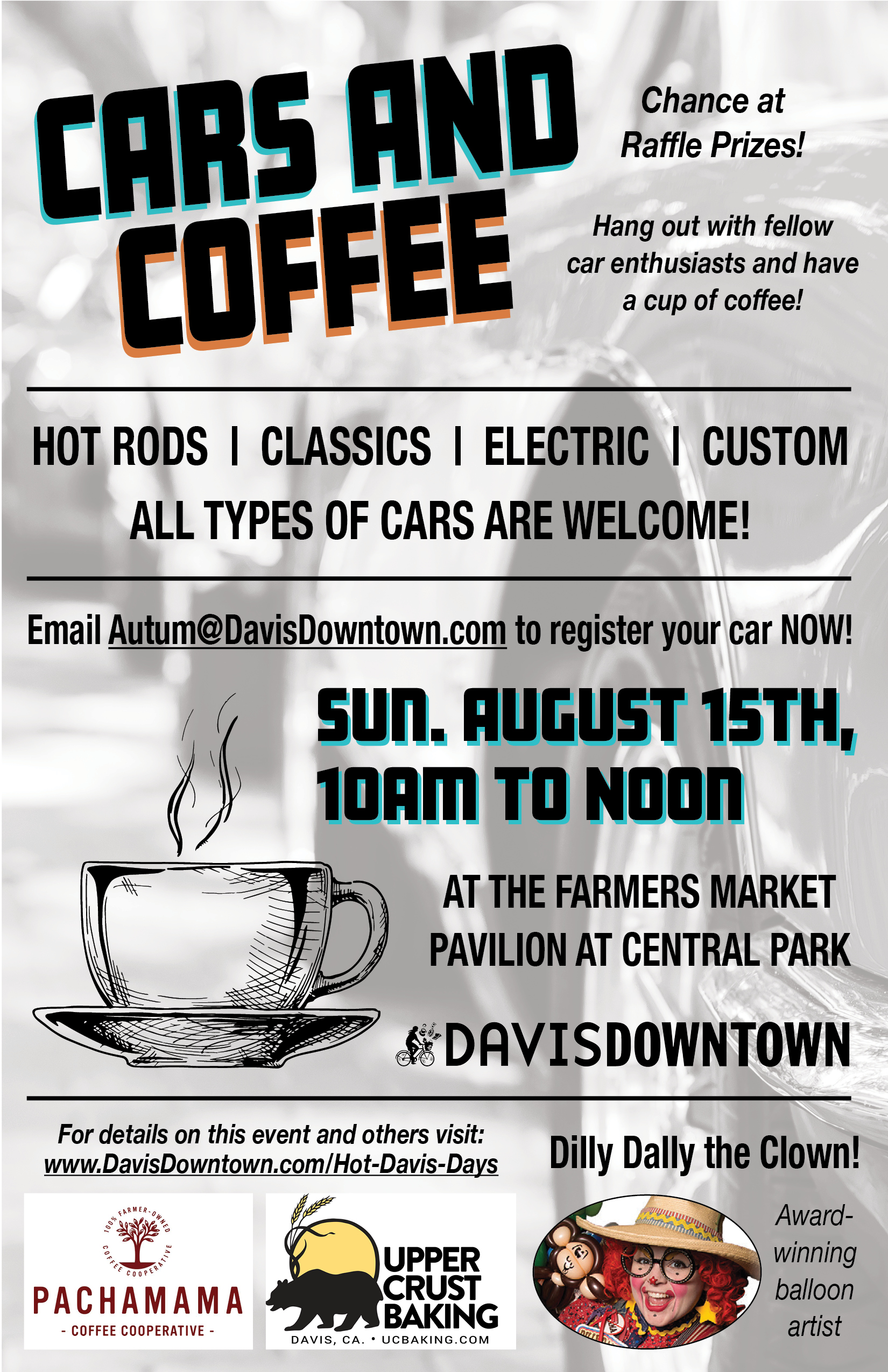 3 days of hot summer deals including our downtown Summer Treat Crawl, which offers specials on ice cream, boba tea, iced coffee, and other desserts. On day 2 of the extravaganza, we are celebrating the summer with a 3-hour concert on G Street, where we are extending the outdoor pedestrian-only area between 2nd and 3rd. Also, for families, friends, and car enthusiasts we will have our Cars & Coffee meet on Aug. 15th from 10am to noon, complete with coffee from Pachamama Coffee and pastries from Upper Crust as well as the appearance of award-winning balloon artist, Dilly Dally the Clown, for children.