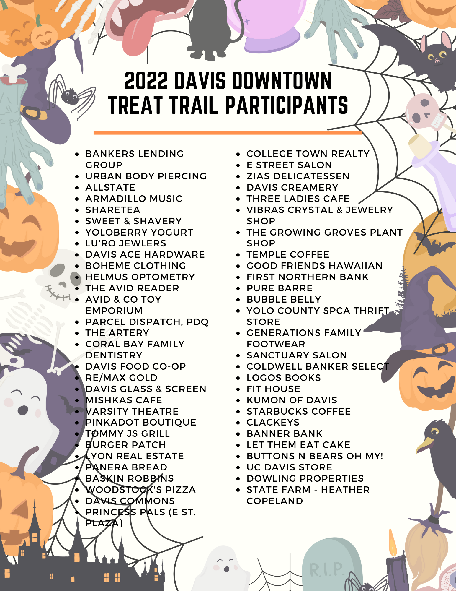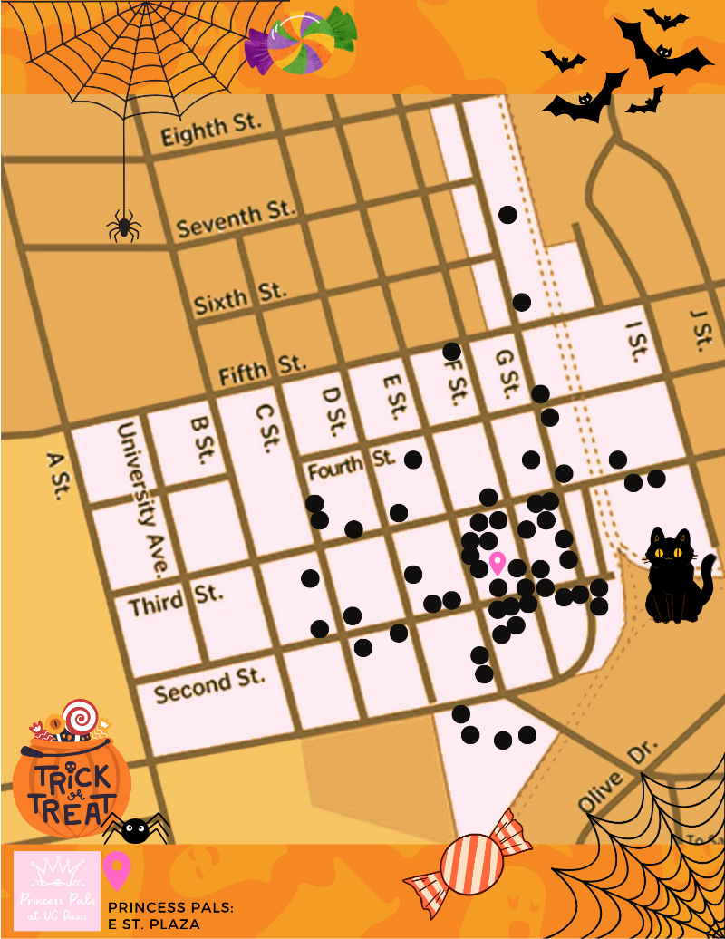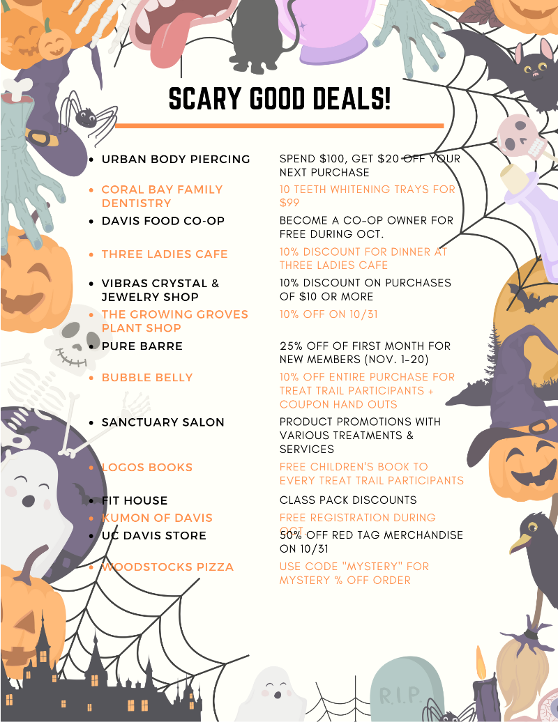 Monday, 10/31, 2:30 pm – 5:30 pm: The famous Davis Downtown Treat Trail is back! Princess Pals will also be along the trail passing out treats, so be sure to snap a picture!
